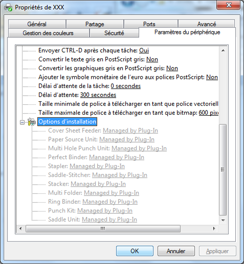 Vous pouvez définir un périphérique en option sous l'onglet [Paramètres du périphérique] et le rendre disponible pour le pilote d'imprimante.