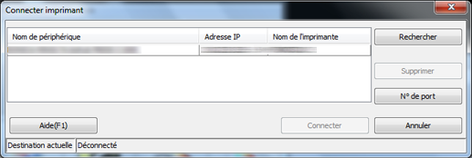 Sur l'écran [Connecter l'imprimant], vous pouvez rechercher les contrôleurs d'image, les supprimer de la liste, entrer les numéros de port, authentifier les connexions et modifier l'affichage des listes.