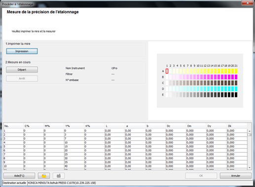 L'impression de la charte est exécutée. L'écran [Mesure de la précision de l'étalonnage] réapparaît à la fin de l'impression.