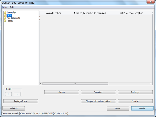 [Exporter]/[Enregistrer] | Exporte une courbe de tonalité que vous sélectionnez dans la liste dans [Local], [Mes documents] ou [Réseau], lorsque [Controller] est sélectionné dans l'arborescence. Enregistre la courbe de tonalité sélectionnée dans [Controller], lorsqu'un dossier autre que [Controller] est sélectionné dans l'arborescence. |