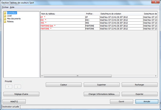 (arborescence) | Affiche sous forme d'arborescence les endroits où sont enregistrées les tables de couleurs spot ([Contrôleur], [Local], [Mes documents] et [Réseau]). |