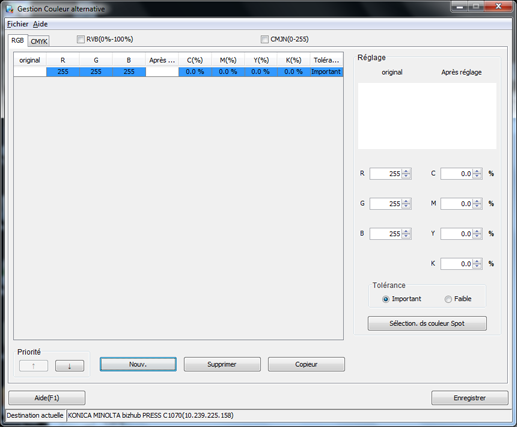 Lorsque l'onglet [RGB] est sélectionné, l'affichage de l'écran [Gestion Couleur alternative] est le suivant.