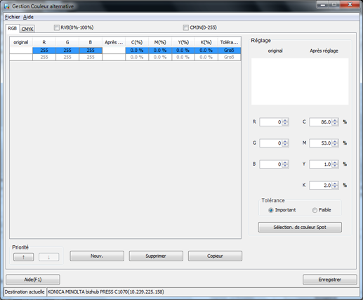 Cliquez sur l'onglet [RGB] ou [CMYK] sur l'écran [Gestion Couleur alternative].