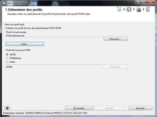 Sur l'écran Détermination des profils, spécifiez le profil d'imprimante et le profil de la source RVB utilisés par le profil du lien périphériques RVB-CMJN. De plus, vous pouvez créer le profil d'imprimante nécessaire.