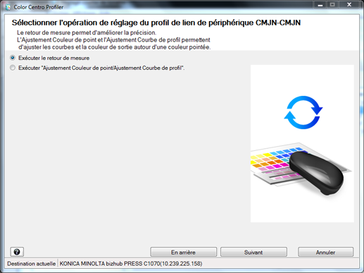 [Exécuter le retour de mesure] ou [Exécuter "Ajustement Couleur de point/Ajustement Courbe de profil"] et cliquez sur [Suivant].