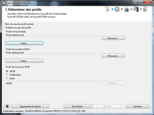 Sur l'écran Déterminer des profils, spécifiez le profil d'imprimante, le profil de la cible CMJN et le profil de la source RVB utilisés par le jeu de profils. Vous pouvez aussi créer le profil d'imprimante et le profil cible CMJN.