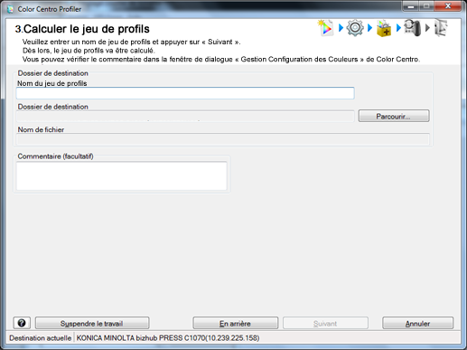 Saisir un nom de jeu de profils et un commentaire. Dans le champ Commentaire, entrez, si besoin est, un commentaire à intégrer au jeu de profils que vous créez. Vous pouvez confirmer le commentaire en sélectionnant le jeu de profils sur Color Centro Profiler.