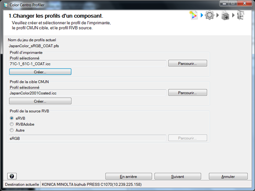 Spécifiez le profil cible CMJN utilisé par le jeu de profils. Pour utiliser le profil cible CMJN existant, cliquez sur [Parcourir]. Pour créer le nouveau profil cible CMJN existant, cliquez sur [Créer].