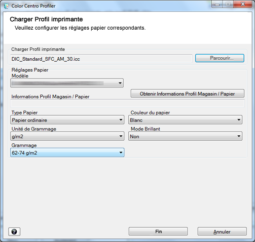 Le profil d'imprimante sélectionné apparaît sur l'écran [Charger Profil imprimante]. Spécifiez [Type Papier], [Couleur du papier] et [Unité de Grammage] selon vos besoins. Puis, cliquez sur [Fin] pour retourner à l'écran [1.Changer les profils d'un composant].