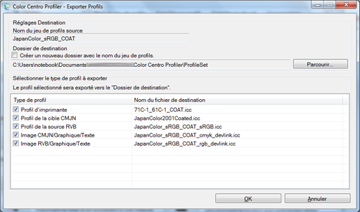 Pour enregistrer les profils exportés dans le dossier avec le nom du jeu de profils, cochez [Créer un nouveau dossier avec le nom du jeu de profils].