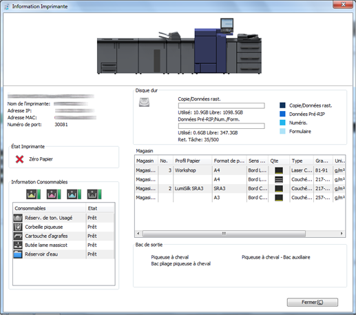 [Disque dur] | Affiche sous forme de graphique et de valeurs numériques l'espace disque utilisé et l'espace libre nécessaire à la copie et aux données de tramage de la tâche. Affiche également sous forme de graphique et de valeurs numériques l'espace disque utilisé et l'espace libre nécessaire aux données de prétramage, à la numérisation et au formulaire. Le nombre de tâches en attente est également affiché. |