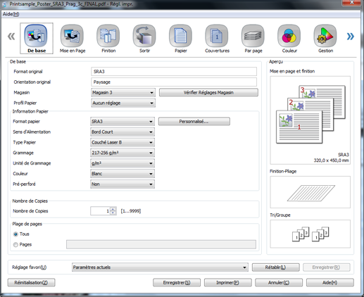[Plage de pages] | Spécifiez la plage d'impression. Ce réglage n'est pas conservé même en cliquant sur [Enregistrer. (La fermeture de l'écran [Mod. Tâches] restaure le réglage d'origine.) Vous ne pouvez l’activer que lors de l'impression de la tâche en appuyant sur [Imprimer]. |