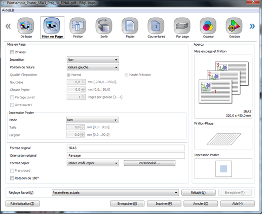 Les éléments de réglage ici sont les mêmes que ceux de l'écran "Mise en page" du pilote Plug-in PS à l'exception des réglages [Impression Poster]. Pour une description des éléments de configuration commune, voir Mise en page.
