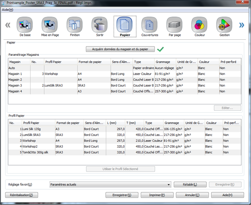 Les éléments de réglage ici sont les mêmes que ceux de l'écran "Papier" du pilote Plug-in PS à l'exception des réglages [Editer] du [Paramétrage Magasins]. Pour une description des éléments de configuration commune, voir Papier.