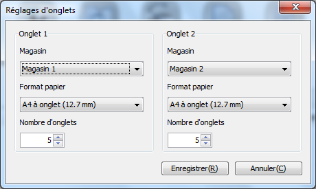 Pour [Onglet 1] et [Onglet 2], paramétrez [Magasin], [Format papier] et [Nombre d'onglets], puis cliquez sur [Enregistrer].