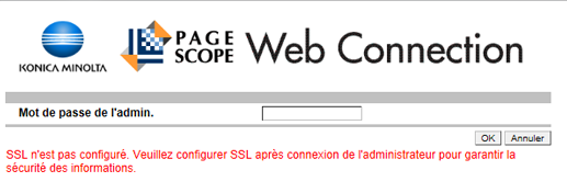 Pour assurer la sécurité des données, effectuez la configuration SSL en mode administrateur. Le paramètre SSL figure dans les réglages de l'onglet [Sécurité]. Pour en savoir plus, voir Activer SSL.