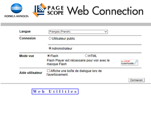 PageScope Web Connection procure le mode utilisateur ou le mode administrateur en fonction de la procédure de connexion.