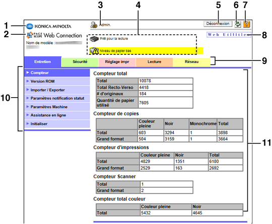 2 | Logo PageScope Web Connection | Pour passer à l'écran où sont affichées les informations version et le copyright, cliquez sur le logo PageScope Web Connection. Pour passer au site web suivant, cliquez sur le logo PageScope Web Connection à l'écran. http://www.pagescope.com Le nom de modèle indique le nom de modèle de la machine que vous utilisez. |