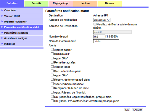 Cliquez sur [Paramètres notification statut] dans le menu de l'onglet [Entretien] pour afficher cet écran.