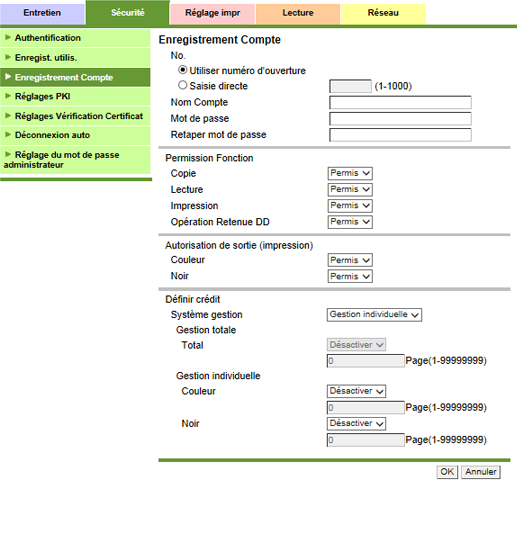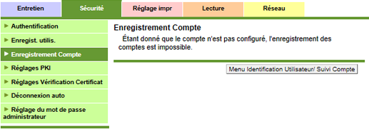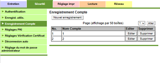 Cliquez sur [Enregistrement Compte] sous l'onglet [Sécurité] pour afficher cet écran.