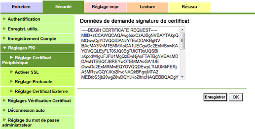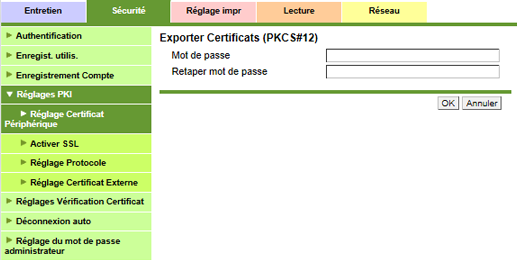 Pour afficher cet écran, cliquez sur [Réglages PKI] - [Réglage Certificat Périphérique] sous l'onglet [Sécurité].