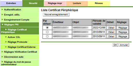 Pour spécifier un certificat par défaut, cliquez sur la case d'option du certificat dans le champ [Par défaut] et ensuite sur [OK]. Si l'émetteur du certificat sélectionné indique [Demande de certificat en cours] dans la liste, le certificat ne peut pas être défini par défaut.