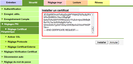 Collez la CSR (demande de signature de certificat) au format texte PEM provenant d'une autorité de certification extérieure dans la zone de texte de l'écran.