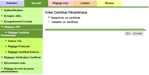 Cliquez sur la case d'option [Supprimer un certificat] et cliquez sur [OK].