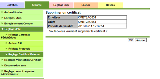 Pour afficher cet écran, cliquez sur [Réglages PKI] - [Réglage Certificat Externe] sous l'onglet [Sécurité].