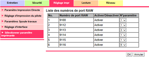 Cet écran vous permet d'attribuer les paramètres imprimante spécifiés dans [Paramètre Impression Directe] à chacun des six numéros de port RAW.
