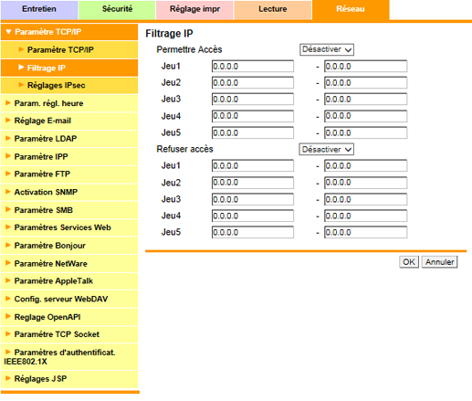 Pour afficher ce écran, cliquez sur [Paramètre TCP/IP] - [Filtrage IP] sous l'onglet [Réseau].
