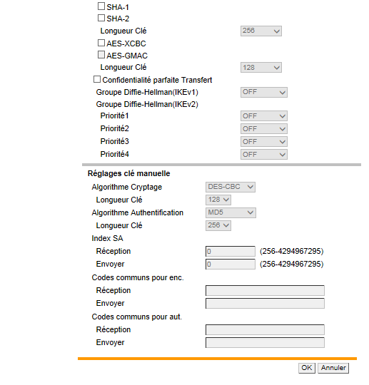 Cochez les cases de [Algorithme Cryptage ESP], [Algorithme Authentification ESP] et [Algorithme Authentification AH] à définir. Sélectionnez la longueur clé à définir dans la liste déroulante [Longueur Clé] en fonction des éléments sélectionnés.
