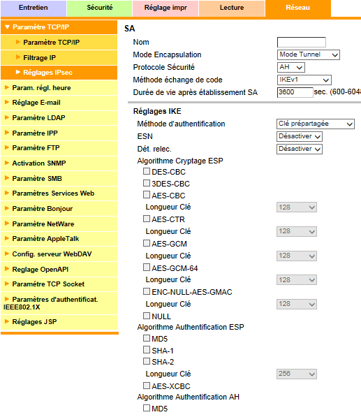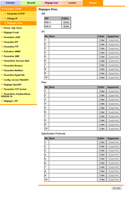 Enregistre les réglages SA, modifie et supprime les réglages SA enregistrés. Pour en savoir plus sur les réglages, voir [Configuration réseau] - [Réglage NIC] - [Paramètre TCP/IP] dans Réglage administrateur.