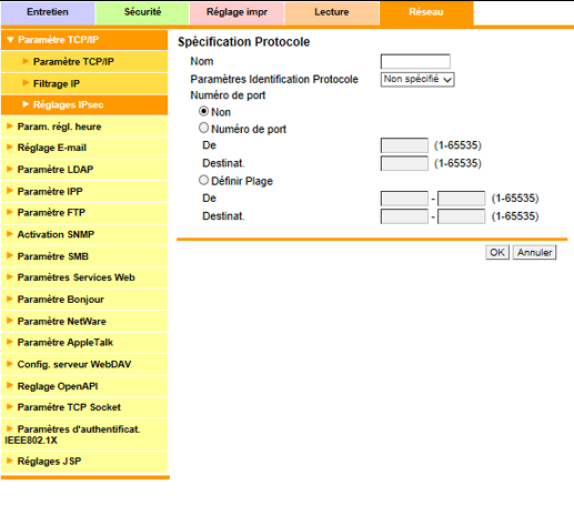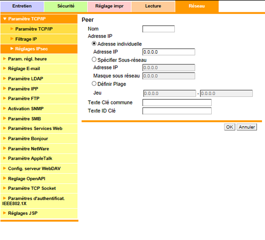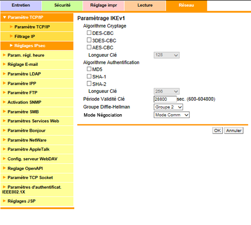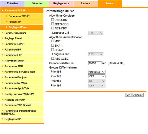 Sélectionnez la case d'option [Réglages IPsec] et cliquez sur [OK]. L'écran [Réglages IPsec] s'affiche.