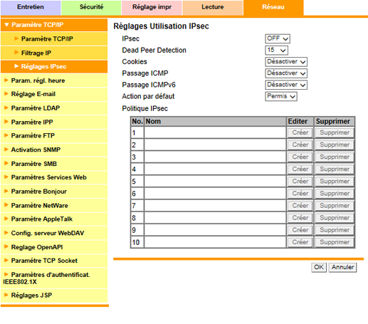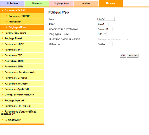 Lorsque vous avez terminé tous les réglages, cliquez sur la touche [OK] de l'écran [Réglages Utilisation IPsec]. Un clic sur [Annuler] annule le réglage.