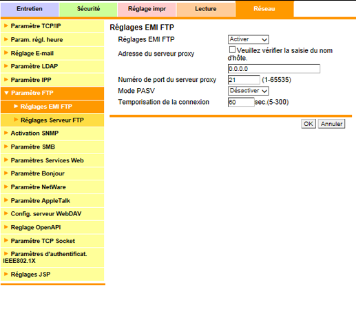 Cliquez sur [Paramètre FTP] - [Réglages EMI FTP] sous l'onglet [Réseau] pour afficher cet écran.