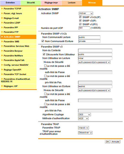 Cliquez sur [Activation SNMP] dans le menu de l'onglet [Réseau] pour afficher cet écran.