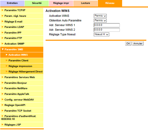 Cliquez sur [Paramètre SMB] - [Activation WINS] sous l'onglet [Réseau] pour afficher cet écran.