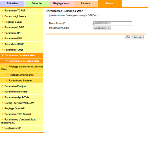 Cliquez sur [Paramètres Services Web] - [Paramètres Services Web] sous l'onglet [Réseau] pour afficher cet écran.