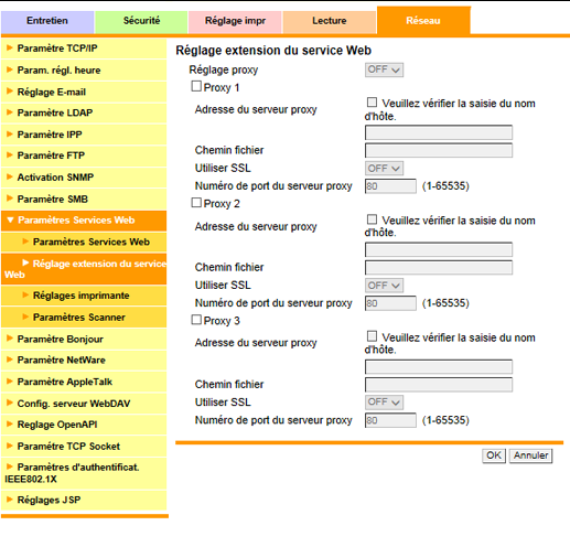 Les contenus sont les mêmes que ceux accédés en sélectionnant [Configuration réseau] - [Réglage NIC] - [Paramètres Services Web] dans Réglage administrateur.