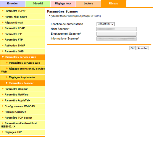 Pour afficher cet écran, cliquez sur [Paramètres Services Web] - [Paramètres Scanner] sous l'onglet [Réseau].
