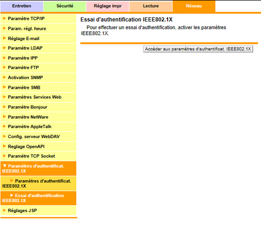 Si vous sélectionnez [OFF] sous [Paramètres d'authentificat. IEEE802.1X], vous ne pouvez pas effectuer l'essai d'authentification IEEE802.1X. Cliquez sur [Paramètres d'authentificat. IEEE802.1X] pour basculer le réglage sur [ON].