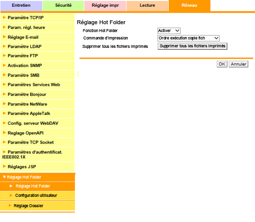 Pour afficher cet écran, cliquez sur [Réglage Hot Folder] - [Réglage Hot Folder] sous l'onglet [Réseau].