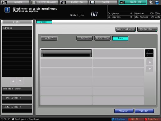 La liste des adresses e-mail est affichée par défaut. L'onglet de destination par défaut de l'écran [NUMERISER] peut être défini sous Utilitaire/Compteur - [Réglage utilisateur] - [Configuration scanner]. Pour en savoir plus, voir Configuration scanner : définition des valeurs par défaut des fonctions de numérisation.