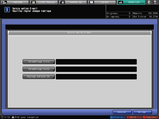 Appuyez sur [Valider] à l'écran [Saisie option E-mail] pour revenir à l'écran [NUMERISER].