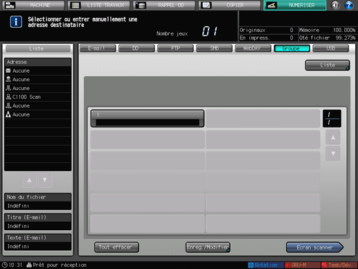La liste des adresses e-mail est affichée par défaut. L'onglet de destination par défaut de l'écran [NUMERISER] peut être défini sous Utilitaire/Compteur - [Réglage utilisateur] - [Configuration scanner]. Pour en savoir plus, voir Configuration scanner : définition des valeurs par défaut des fonctions de numérisation.