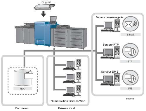 Vous pouvez envoyer les données numérisées par e-mail en fichier joint, les télécharger vers un serveur FTP ou SMB ou encore les enregistrer sur un disque dur. Les données numérisées enregistrées sur le disque dur peuvent être importées sur des ordinateurs connectés au réseau en utilisant des applications compatibles TWAIN et le pilote TWAIN du disque dur.