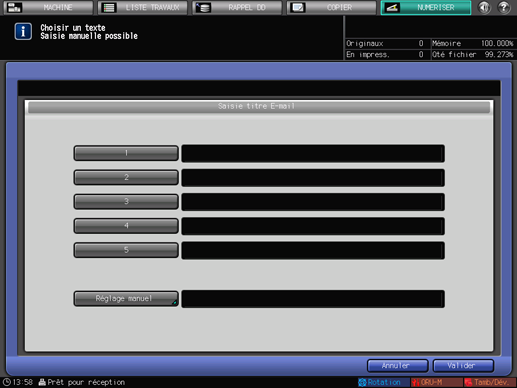 Vous pouvez définir des titres fixes sous [1] à [5] dans Utilitaire/Compteur - [Enregistrement adresse numérisation] - [Saisie titre E-mail]. Pour en savoir plus, voir Enregistrement d'un Objet et d'un Texte d'e-mail.