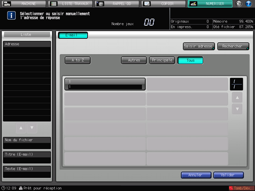La liste des adresses e-mail est affichée par défaut. L'onglet de destination par défaut de l'écran [NUMERISER] peut être défini sous Utilitaire/Compteur - [Réglage utilisateur] - [Configuration scanner]. Pour en savoir plus, voir Configuration scanner : définition des valeurs par défaut des fonctions de numérisation.