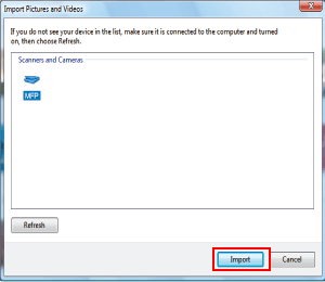 Dans la liste [Scanneurs et appareils photo], sélectionnez la machine et cliquez sur [Importer].